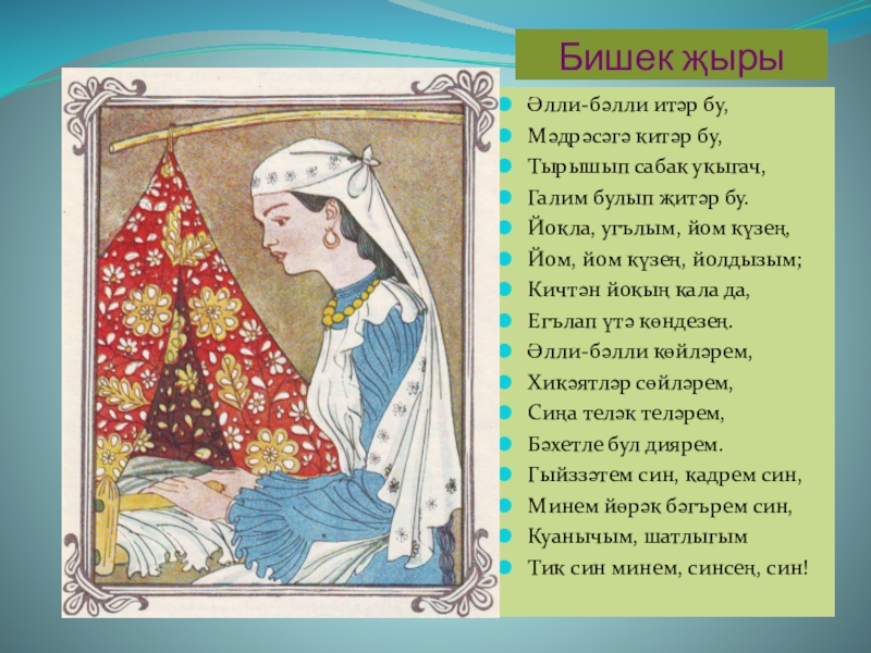 Бишек җыры Әлли-бәлли итәр бу,Мәдрәсәгә китәр бу,Тырышып сабак укыгач,Галим булып җитәр бу.Йокла, угълым, йом күзең,Йом, йом күзең,