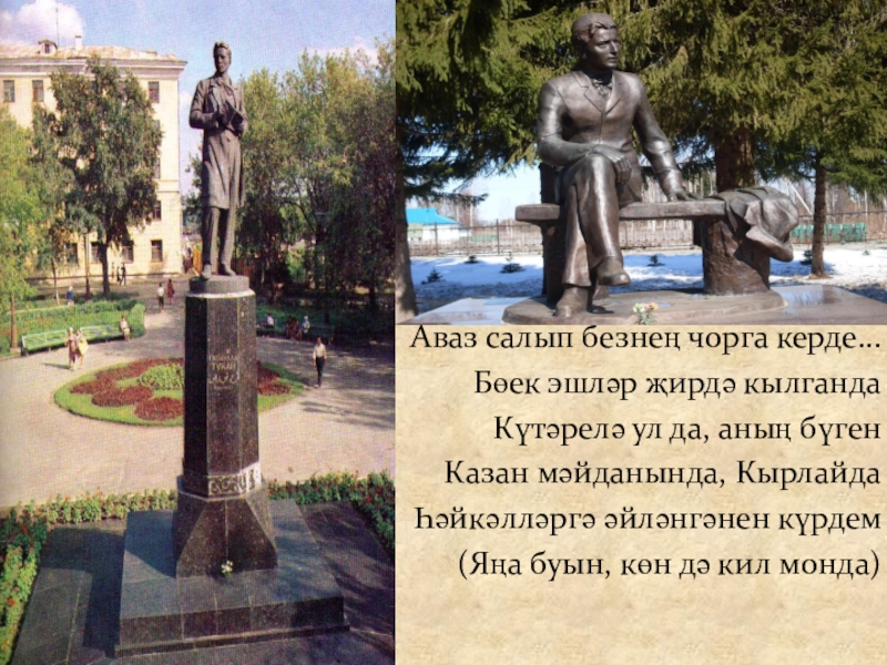 Аваз салып безнең чорга керде...Бөек эшләр җирдә кылгандаКүтәрелә ул да, аның бүгенКазан мәйданында, КырлайдаҺәйкәлләргә әйләнгәнен күрдем(Яңа буын,