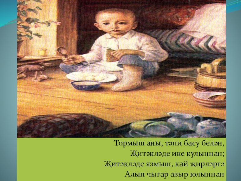 Тормыш аны, тәпи басу белән,Җитәкләде ике кулыннан;Җитәкләде язмыш, кай җирләргәАлып чыгар авыр юлыннан