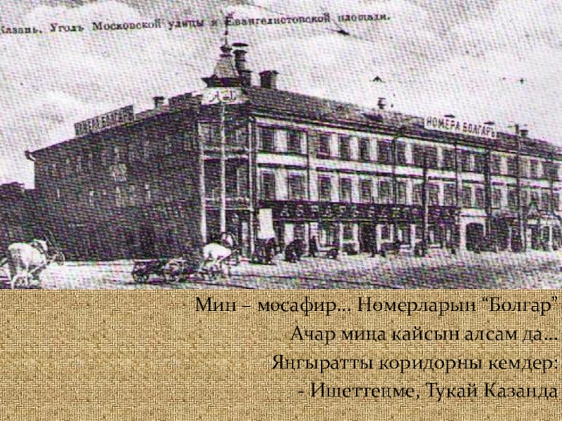 Мин – мөсафир... Номерларын “Болгар” Ачар миңа кайсын алсам да...Яңгыратты коридорны кемдер:- Ишеттеңме, Тукай Казанда