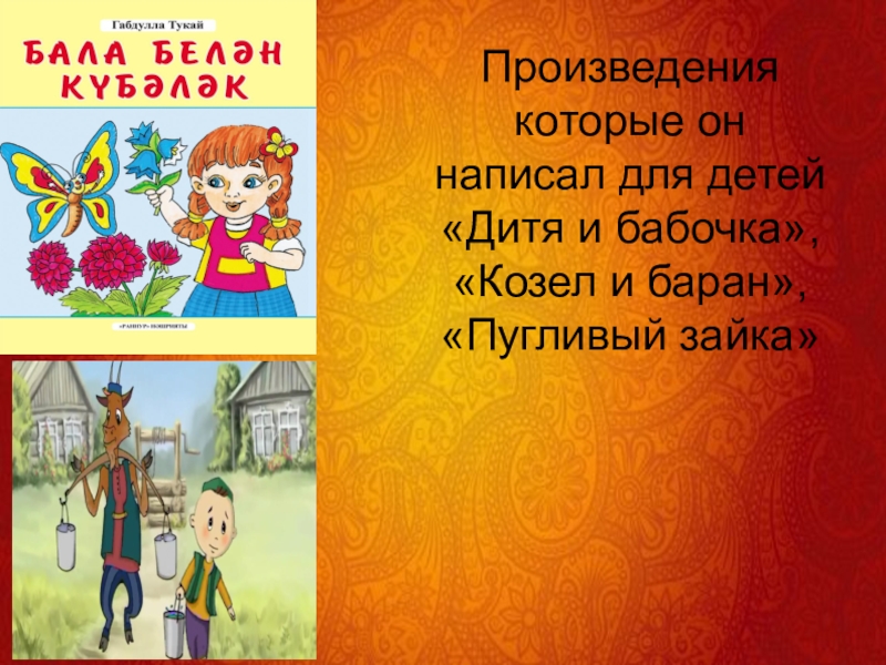 Произведения которые он написал для детей «Дитя и бабочка», «Козел и баран», «Пугливый зайка»