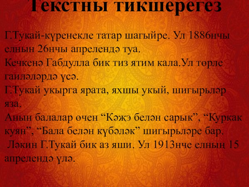 Текстны тикшерегезГ.Тукай-күренекле татар шагыйре. Ул 1886нчы елнын 26нчы апрелендә туа. Кечкенә Габдулла бик тиз ятим кала.Ул төрле