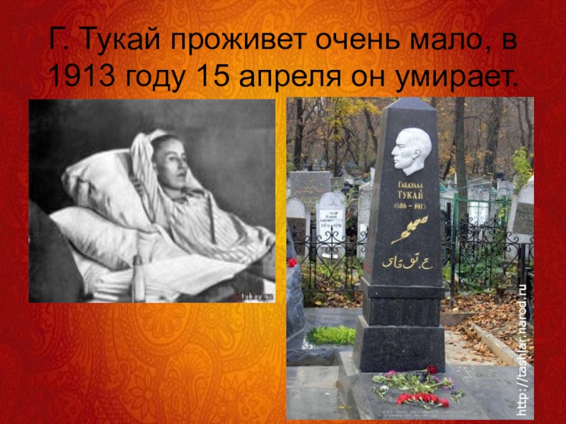 Слайд 9Г. Тукай проживет очень мало, в 1913 году 15 апреля он