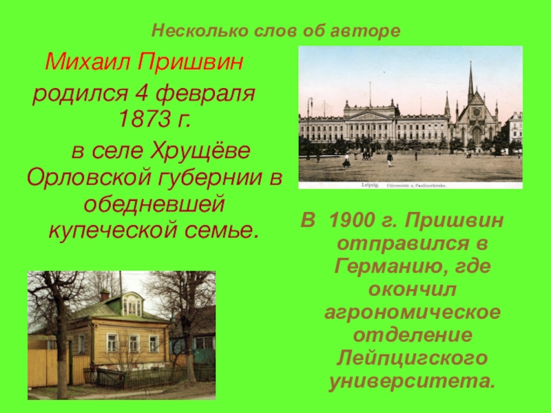 В 1900 г. Пришвин отправился в Германию, где окончил агрономическое отделение Лейпцигского университета.