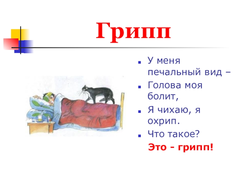 ГриппУ меня печальный вид – Голова моя болит,Я чихаю, я охрип.Что такое?  Это - грипп!