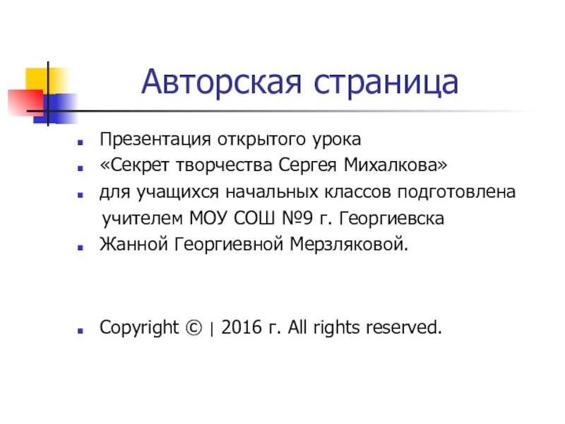 Авторская страницаПрезентация открытого урока«Секрет творчества Сергея Михалкова» для учащихся начальных классов подготовлена  учителем