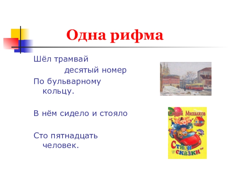 Одна рифмаШёл трамвай      десятый номерПо бульварному
