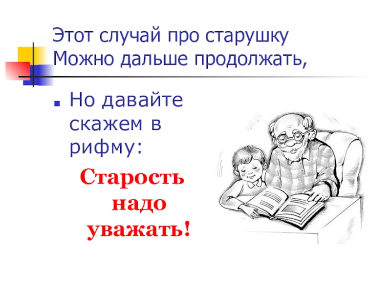 Этот случай про старушку Можно дальше продолжать,Но давайте скажем в рифму:Старость надо уважать!