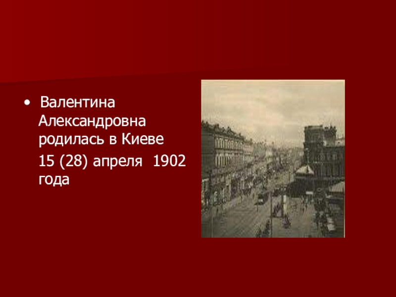 • Валентина Александровна родилась в Киеве   15 (28) апреля 1902 года