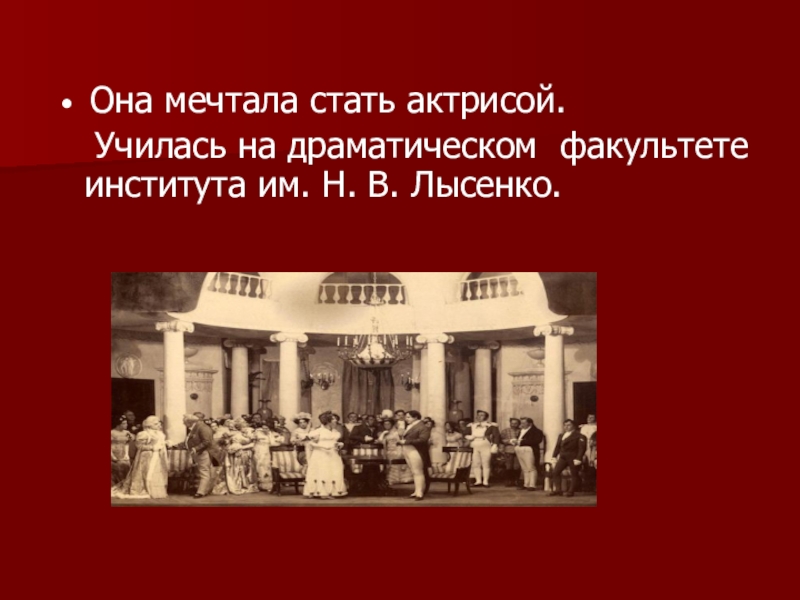 • Она мечтала стать актрисой.  Училась на драматическом факультете  института им. Н. В. Лысенко.