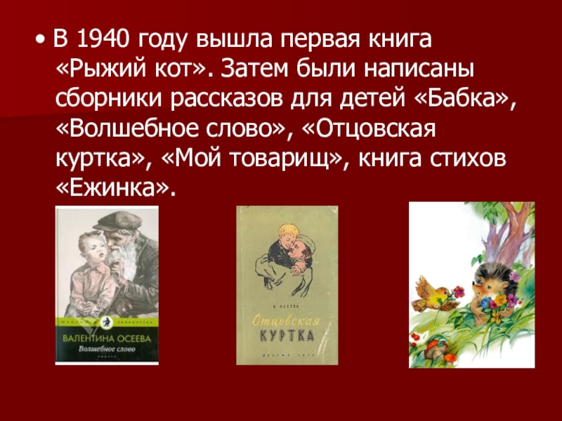 • В 1940 году вышла первая книга «Рыжий кот». Затем были написаны сборники рассказов для детей «Бабка»,