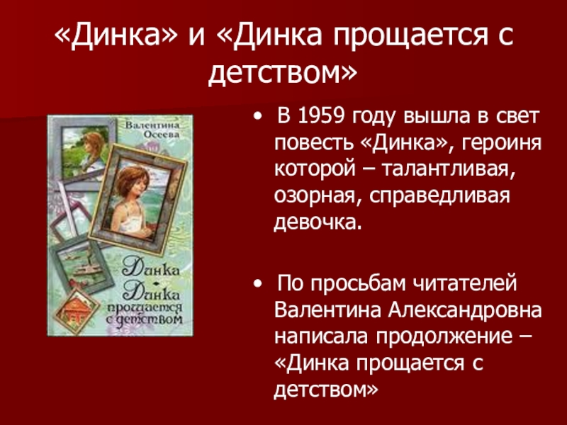 «Динка» и «Динка прощается с детством»• В 1959 году вышла в свет повесть «Динка», героиня которой –