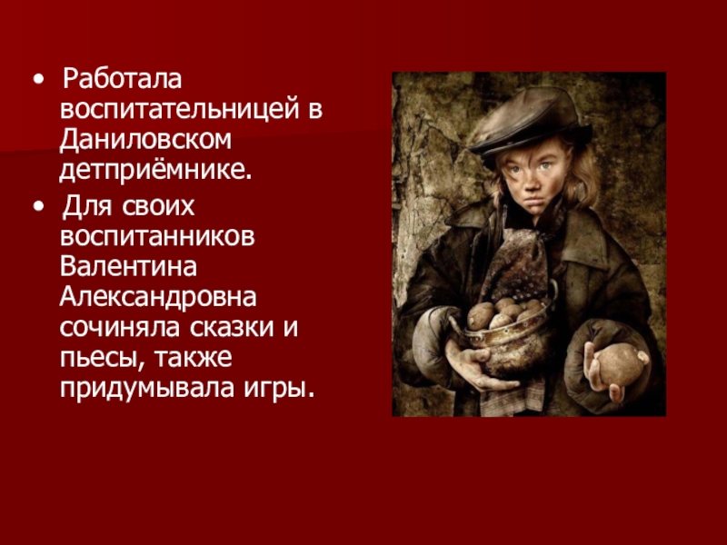 • Работала воспитательницей в Даниловском детприёмнике. • Для своих воспитанников Валентина Александровна сочиняла сказки и пьесы, также