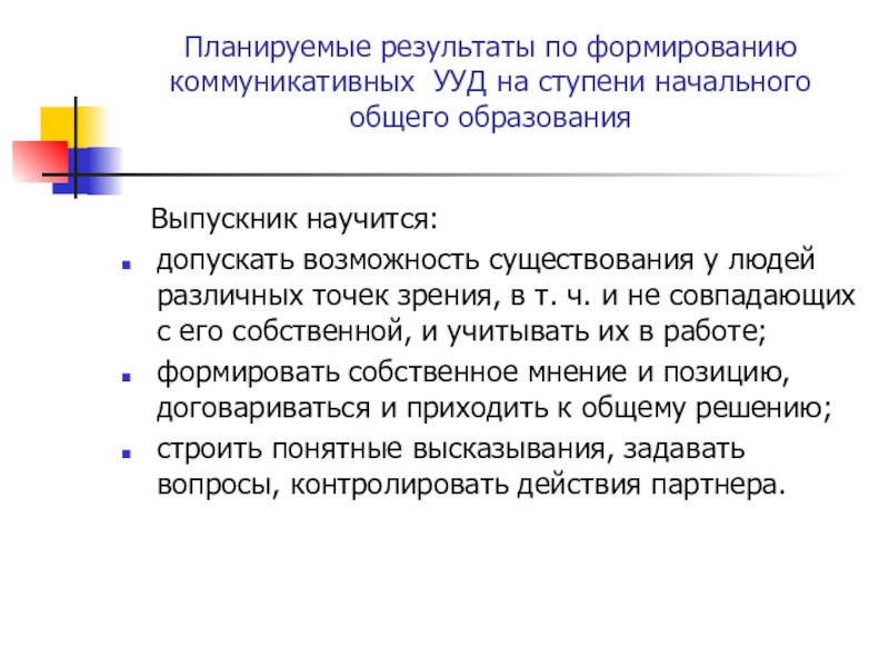 Слайд 27Планируемые результаты по формированию коммуникативных УУД на ступени начального общего образования