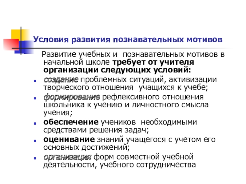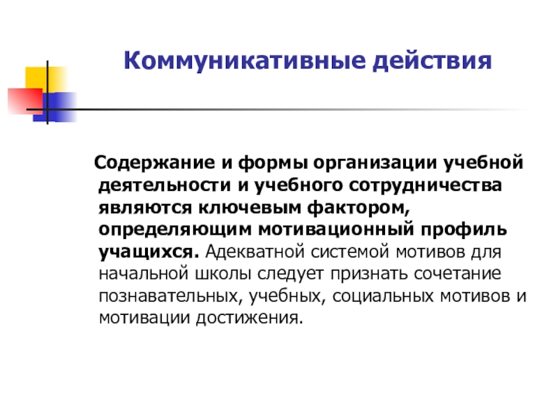 сотрудничества являются ключевым фактором, определяющим мотивационный профиль учащихся. Адекватной системой мотивов для начальной школы следует признать сочетание познавательных, учебных, социальных мотивов и мотивации достижения.