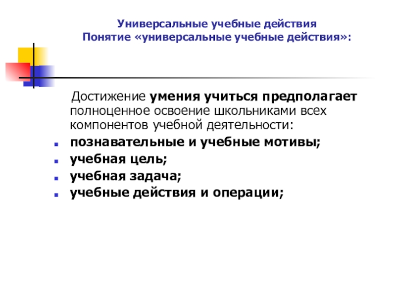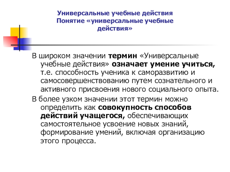 Слайд 3В широком значении термин «Универсальные учебные действия» означает умение учиться, т.е.