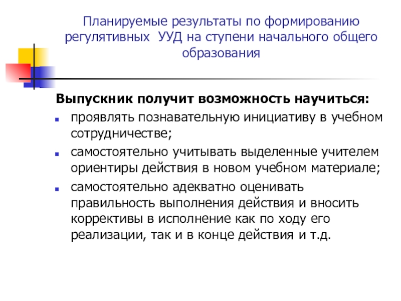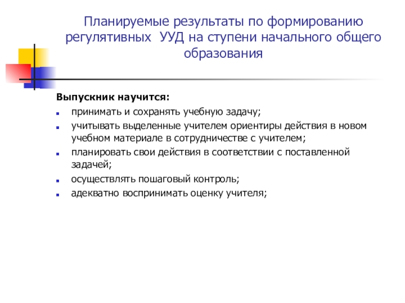Слайд 15Планируемые результаты по формированию регулятивных УУД на ступени начального общего образования
