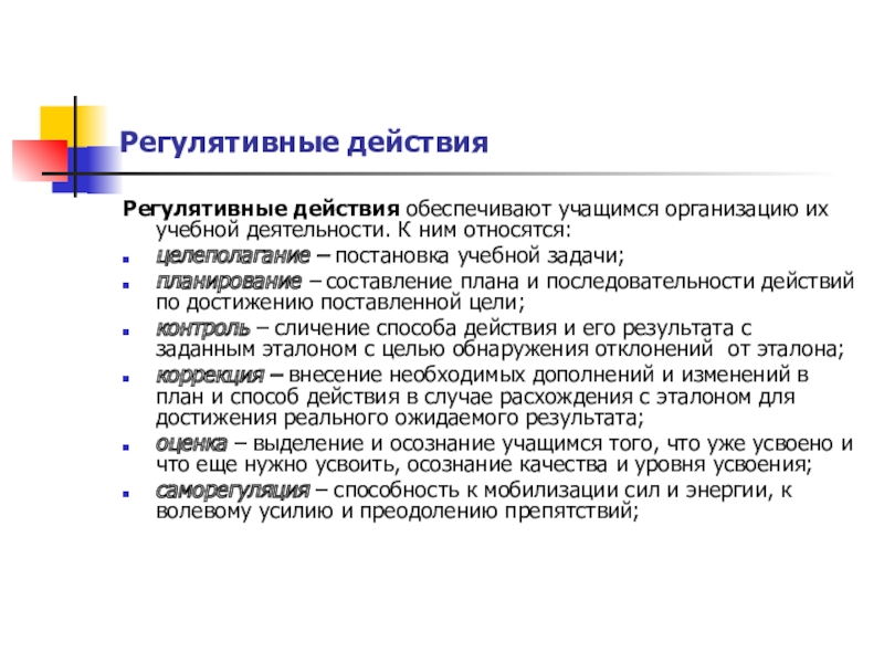 Регулятивные действия обеспечивают учащимся организацию их учебной деятельности. К ним