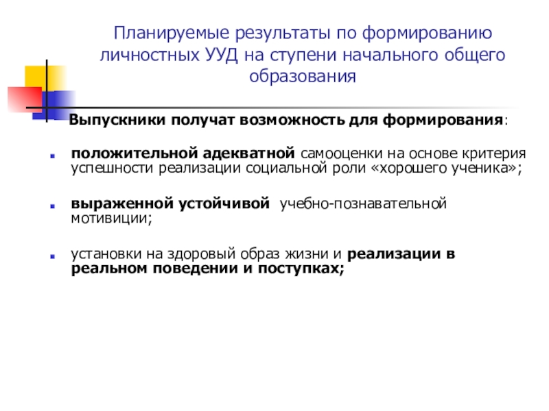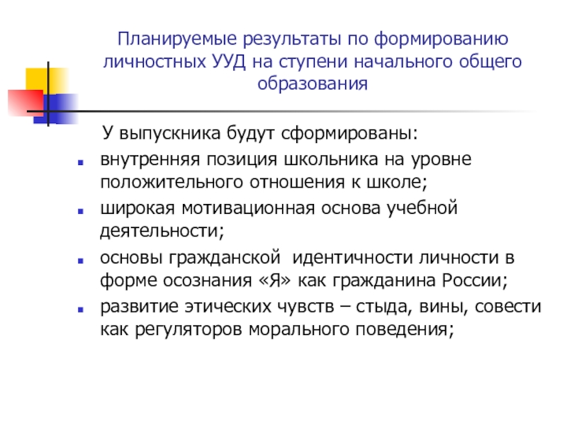 Слайд 11Планируемые результаты по формированию личностных УУД на ступени начального общего образования