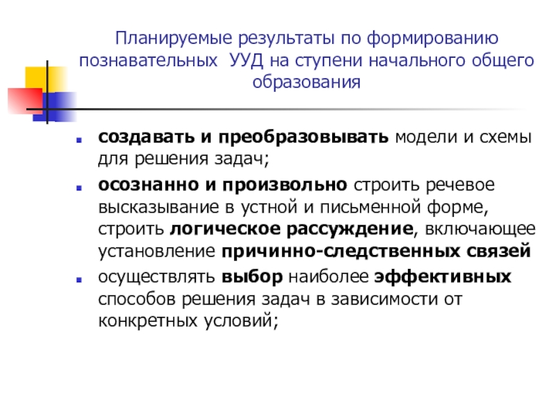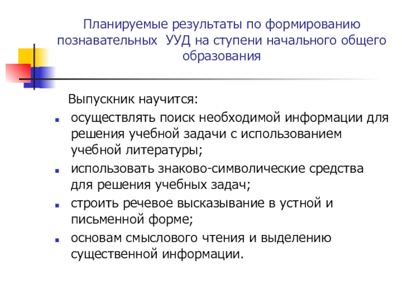 Слайд 21Планируемые результаты по формированию познавательных УУД на ступени начального общего образования