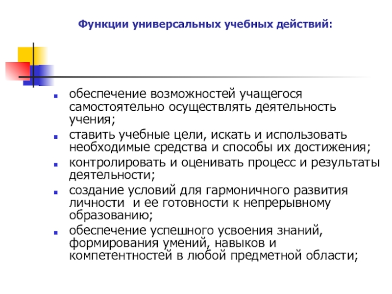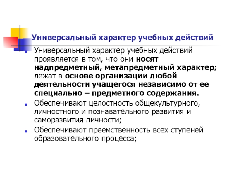 они носят надпредметный, метапредметный характер; лежат в основе организации любой деятельности учащегося независимо от ее специально – предметного содержания.