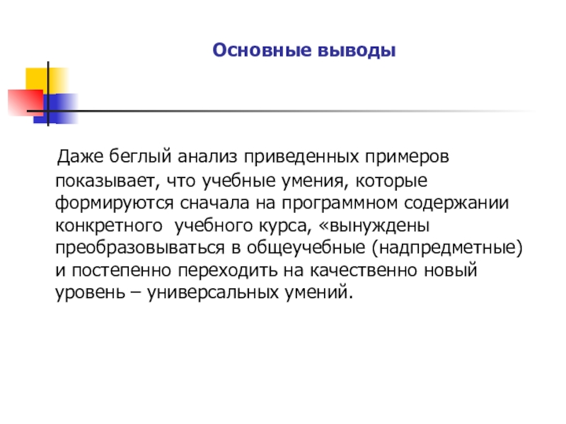 умения, которые формируются сначала на программном содержании конкретного учебного курса, «вынуждены преобразовываться в общеучебные (надпредметные) и постепенно переходить на качественно новый уровень – универсальных умений.