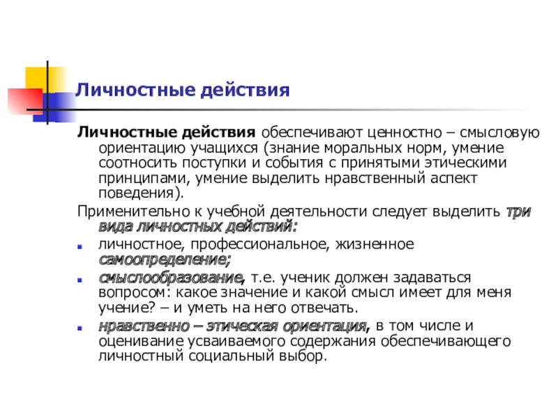 Применительно к учебной деятельности следует выделить три вида личностных действий: