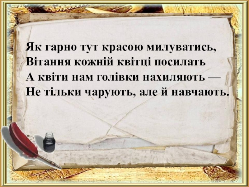 Як гарно тут красою милуватись,Вітання кожній квітці посилатьА квіти нам голівки нахиляють —Не тільки чарують, але й навчають.