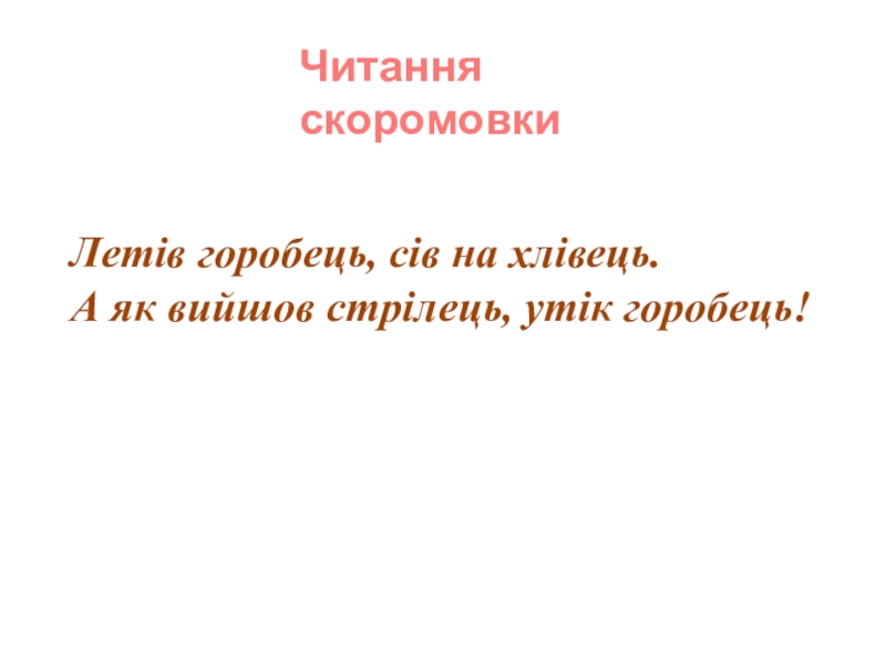 Читання скоромовкиЛетів горобець, сів на хлівець.А як вийшов стрілець, утік горобець!