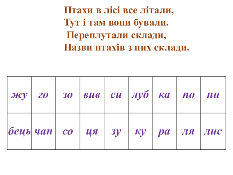 Птахи в лісі все літали, Тут і там вони бували. Переплутали склади, Назви птахів з них склади.