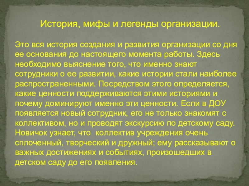 Это вся история создания и развития организации со дня ее основания до настоящего момента работы. Здесь необходимо выяснение того, что именно знают сотрудники о ее развитии, какие истории стали наиболее распространенными. Посредством этого определяется, какие ценности поддерживаются этими историями и почему доминируют именно эти ценности. Если в ДОУ появляется новый сотрудник, его не только знакомят с коллективом, но и проводят экскурсию по детскому саду. Новичок узнает, что коллектив учреждения очень сплоченный, творческий и дружный; ему рассказывают о важных достижениях и событиях, произошедших в детском саду до его появления.