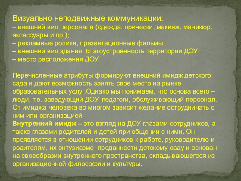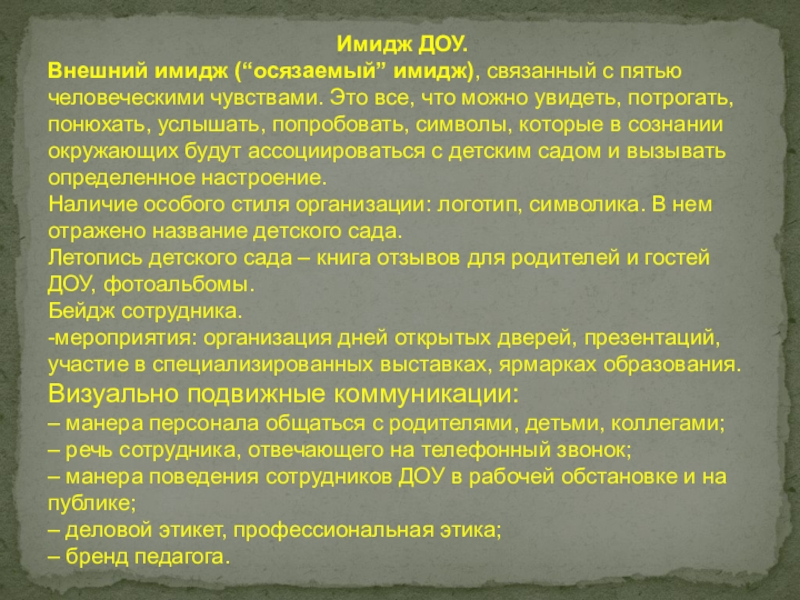 Внешний имидж (“осязаемый” имидж), связанный с пятью человеческими чувствами. Это все, что можно увидеть, потрогать, понюхать, услышать, попробовать, символы, которые в сознании окружающих будут ассоциироваться с детским садом и вызывать определенное настроение.