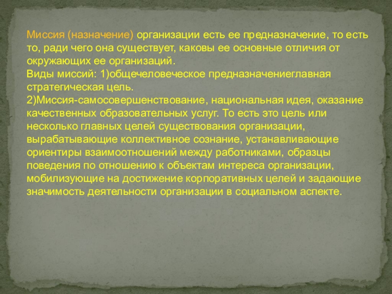 Слайд 7Миссия (назначение) организации есть ее предназначение, то есть то, ради чего