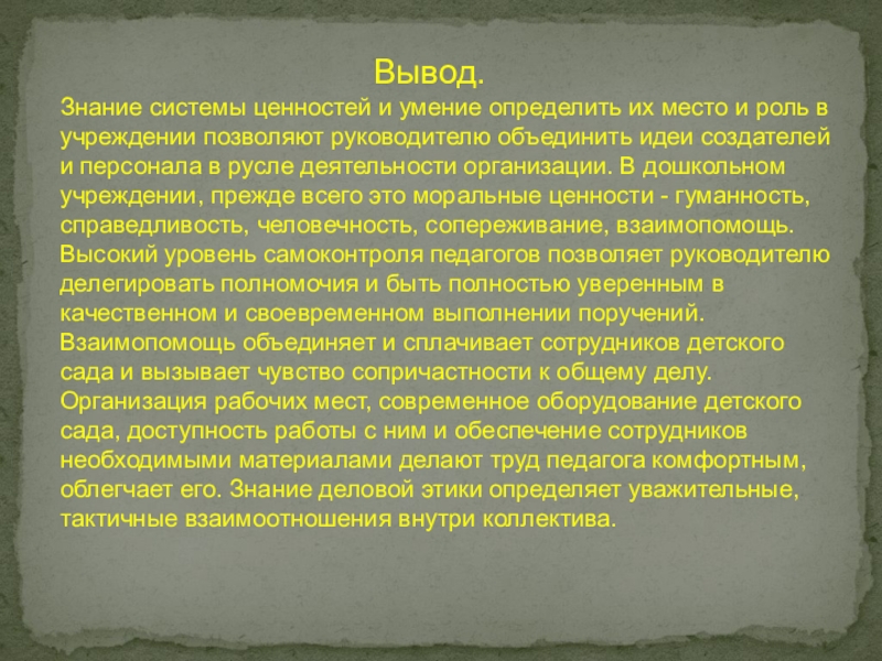 Знание системы ценностей и умение определить их место и роль в учреждении позволяют руководителю объединить идеи создателей и персонала в русле деятельности организации. В дошкольном учреждении, прежде всего это моральные ценности - гуманность, справедливость, человечность, сопереживание, взаимопомощь. Высокий уровень самоконтроля педагогов позволяет руководителю делегировать полномочия и быть полностью уверенным в качественном и своевременном выполнении поручений. Взаимопомощь объединяет и сплачивает сотрудников детского сада и вызывает чувство сопричастности к общему делу. Организация рабочих мест, современное оборудование детского сада, доступность работы с ним и обеспечение сотрудников необходимыми материалами делают труд педагога комфортным, облегчает его. Знание деловой этики определяет уважительные, тактичные взаимоотношения внутри коллектива.