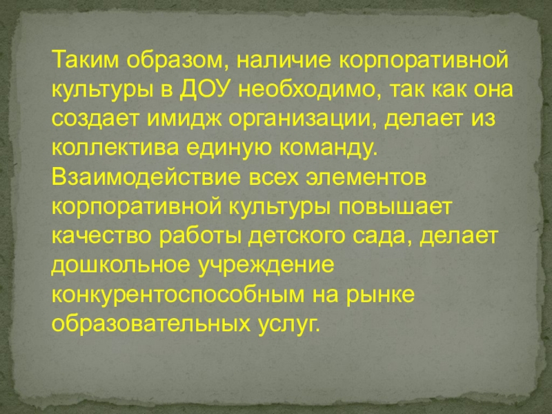 Слайд 15Таким образом, наличие корпоративной культуры в ДОУ необходимо, так как она