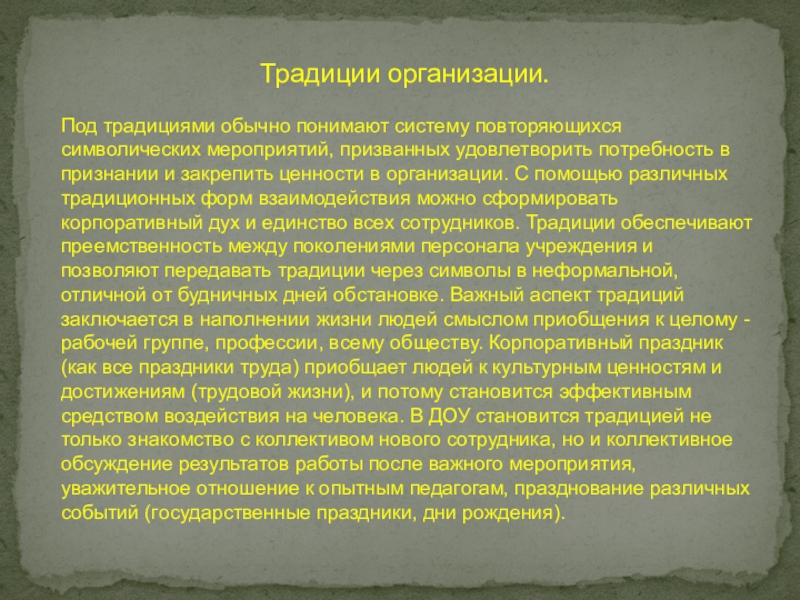 Под традициями обычно понимают систему повторяющихся символических мероприятий, призванных удовлетворить потребность в признании и закрепить ценности в организации. С помощью различных традиционных форм взаимодействия можно сформировать корпоративный дух и единство всех сотрудников. Традиции обеспечивают преемственность между поколениями персонала учреждения и позволяют передавать традиции через символы в неформальной, отличной от будничных дней обстановке. Важный аспект традиций заключается в наполнении жизни людей смыслом приобщения к целому - рабочей группе, профессии, всему обществу. Корпоративный праздник (как все праздники труда) приобщает людей к культурным ценностям и достижениям (трудовой жизни), и потому становится эффективным средством воздействия на человека. В ДОУ становится традицией не только знакомство с коллективом нового сотрудника, но и коллективное обсуждение результатов работы после важного мероприятия, уважительное отношение к опытным педагогам, празднование различных событий (государственные праздники, дни рождения).
