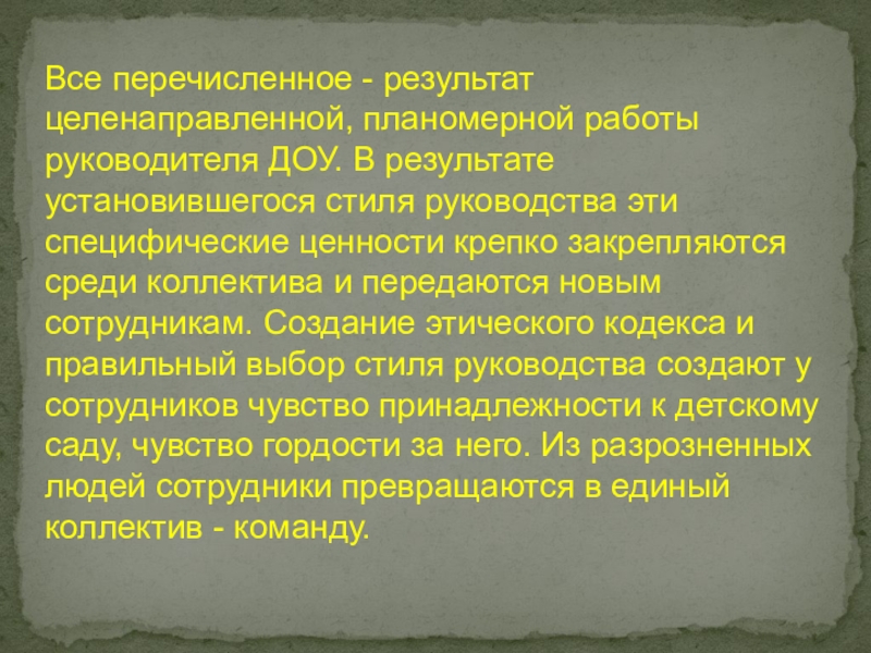 установившегося стиля руководства эти специфические ценности крепко закрепляются среди коллектива и передаются новым сотрудникам. Создание этического кодекса и правильный выбор стиля руководства создают у сотрудников чувство принадлежности к детскому саду, чувство гордости за него. Из разрозненных людей сотрудники превращаются в единый коллектив - команду.