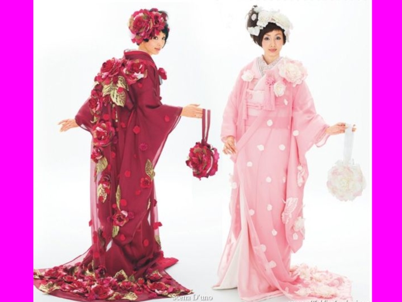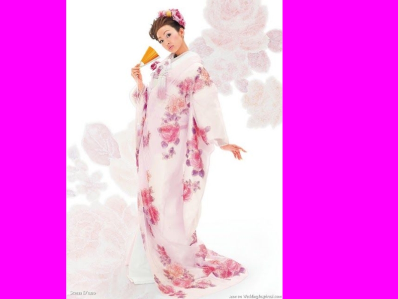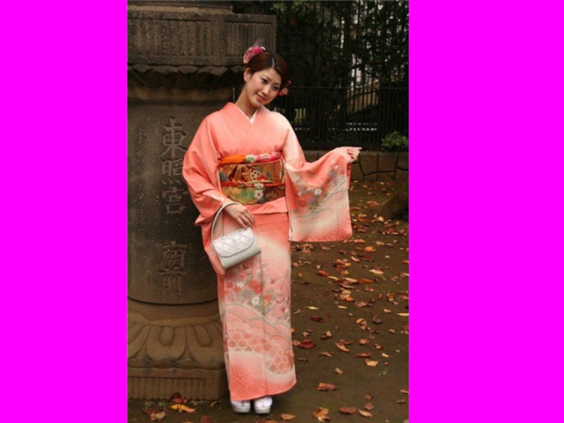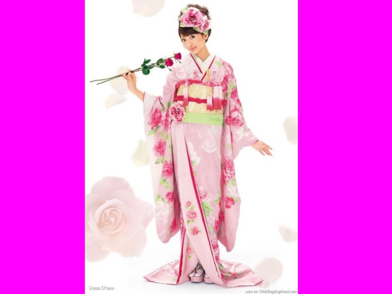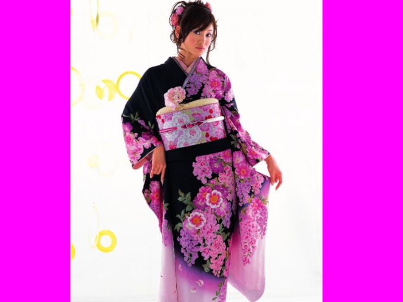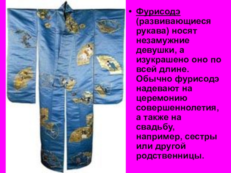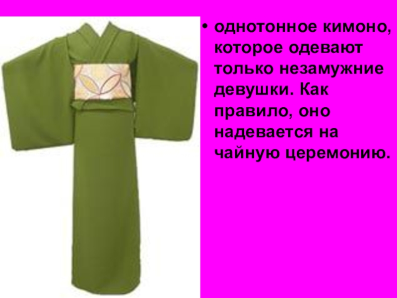 Слайд 10однотонное кимоно, которое одевают только незамужние девушки. Как правило, оно надевается