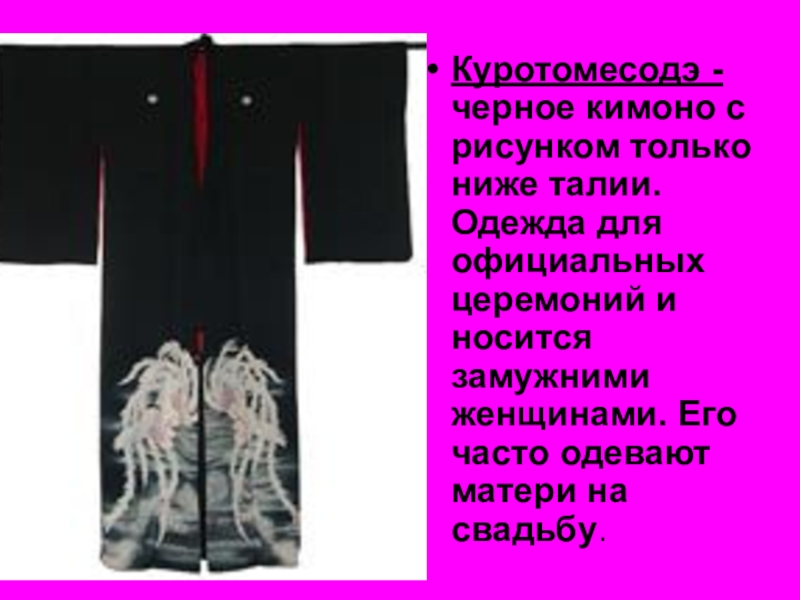 Слайд 7Куротомесодэ - черное кимоно с рисунком только ниже талии. Одежда для