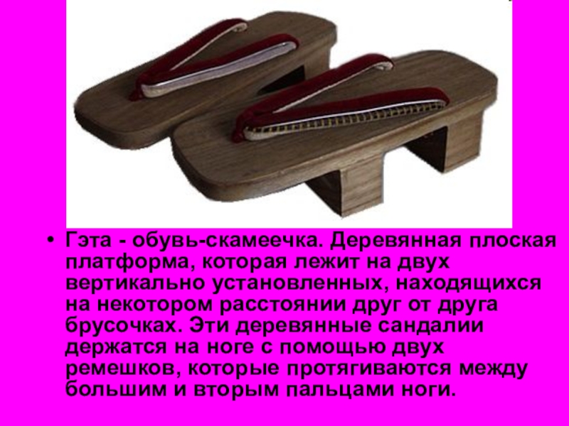Слайд 15Гэта - обувь-скамеечка. Деревянная плоская платформа, которая лежит на двух вертикально