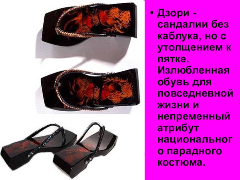 Слайд 16Дзори - сандалии без каблука, но с утолщением к пятке. Излюбленная