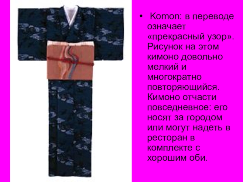 Слайд 11 Komon: в переводе означает «прекрасный узор». Рисунок на этом кимоно