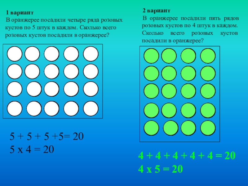 В оранжерее посадили пять рядов розовых кустов по 4 штук в каждом. Сколько всего розовых кустов посадили в оранжерее?