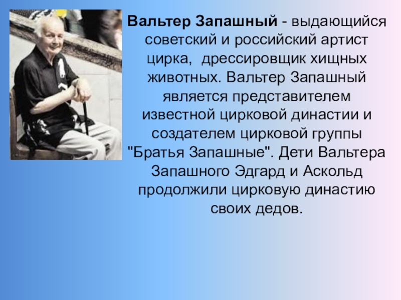 Аскольд Запашный - дрессировщик хищников. В клетку с тиграми впервые вошел в десятилетнем возрасте вместе с отцом и старшим братом Эдгардом.