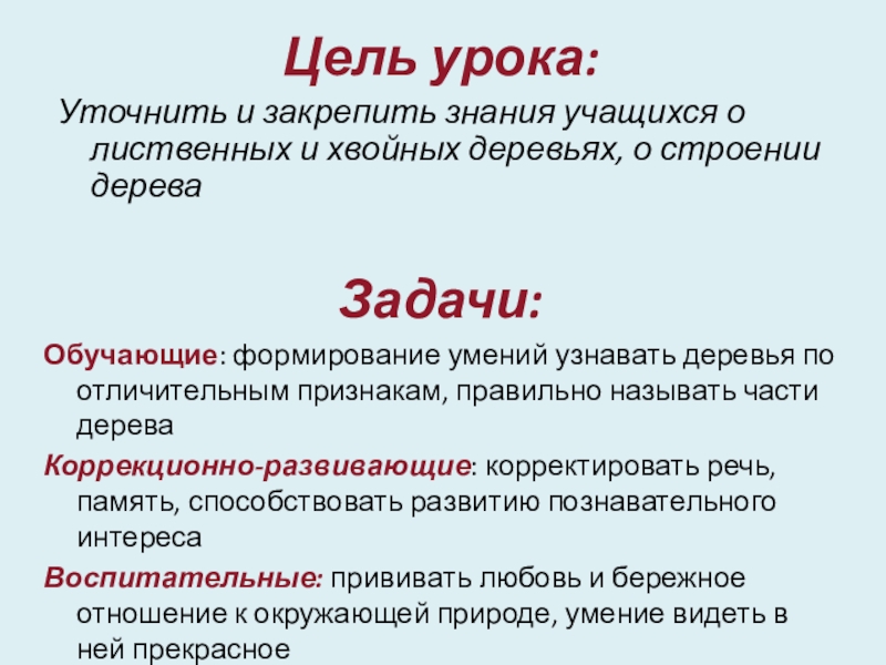 Обучающие: формирование умений узнавать деревья по отличительным признакам, правильно называть части дерева