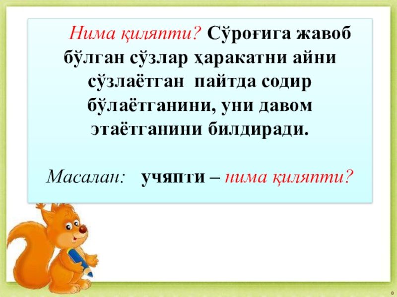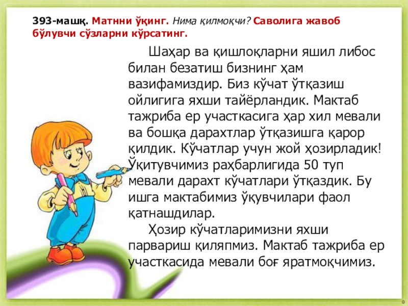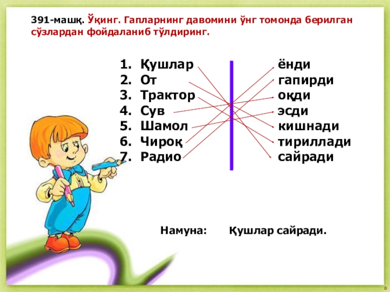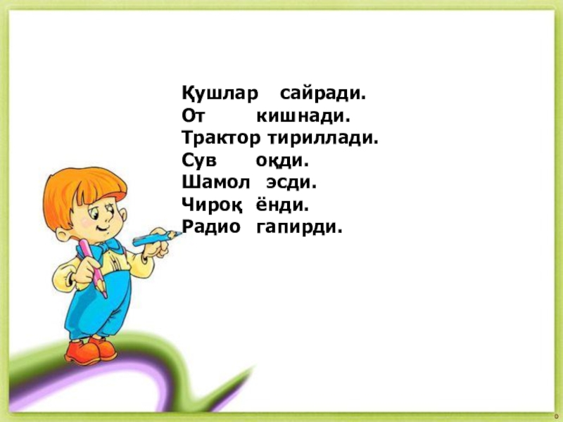 Оғзаки гаплар туздириш орқали нутқини ўстириш, ўйлаш қобилиятини ва чиройли ёзув малакасини ошириш.