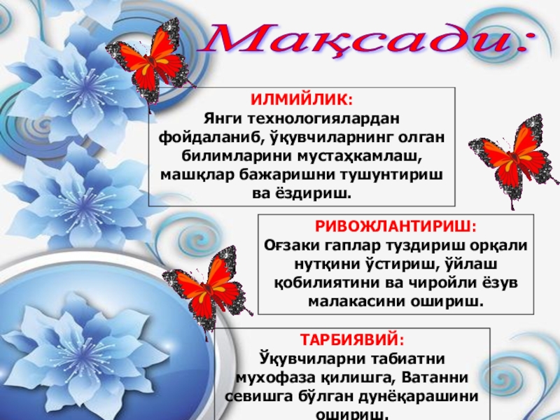 Ўқувчиларни табиатни мухофаза қилишга, Ватанни севишга бўлган дунёқарашини ошириш.