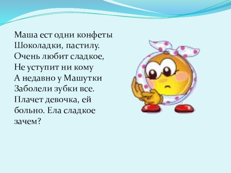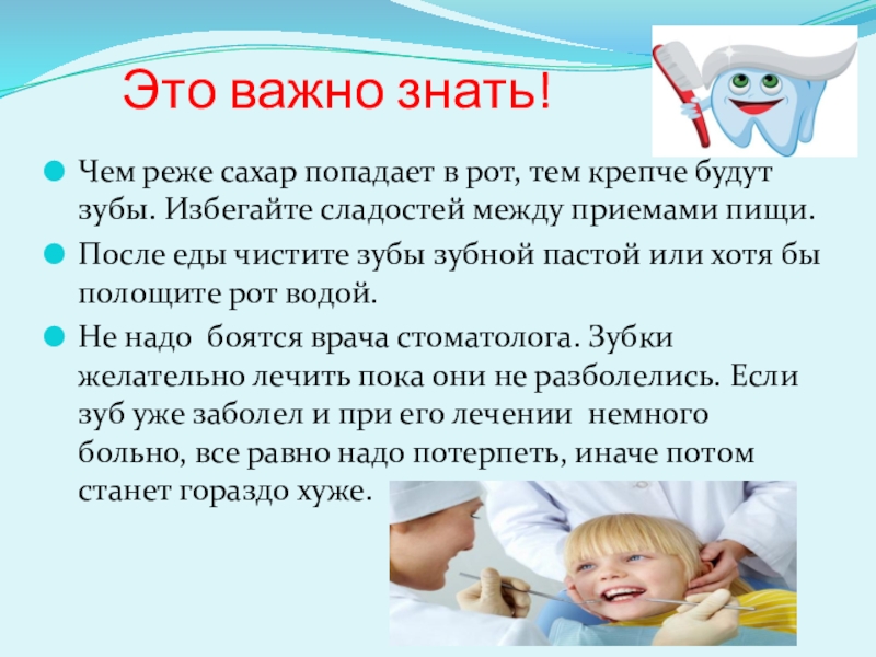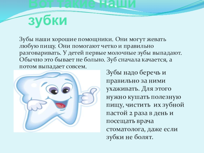 Зубы надо беречь и правильно за ними ухаживать. Для этого нужно кушать полезную пищу, чистить их зубной пастой 2 раза в день и посещать врача стоматолога, даже если зубки не болят.