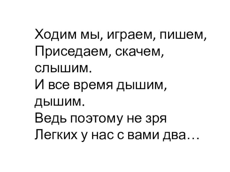 Слайд 8Ходим мы, играем, пишем, Приседаем, скачем, слышим. И все время дышим, дышим. Ведь поэтому