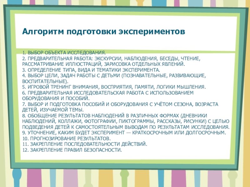 7. Выбор и подготовка пособий и оборудования с учётом сезона, возраста детей, изучаемой темы.